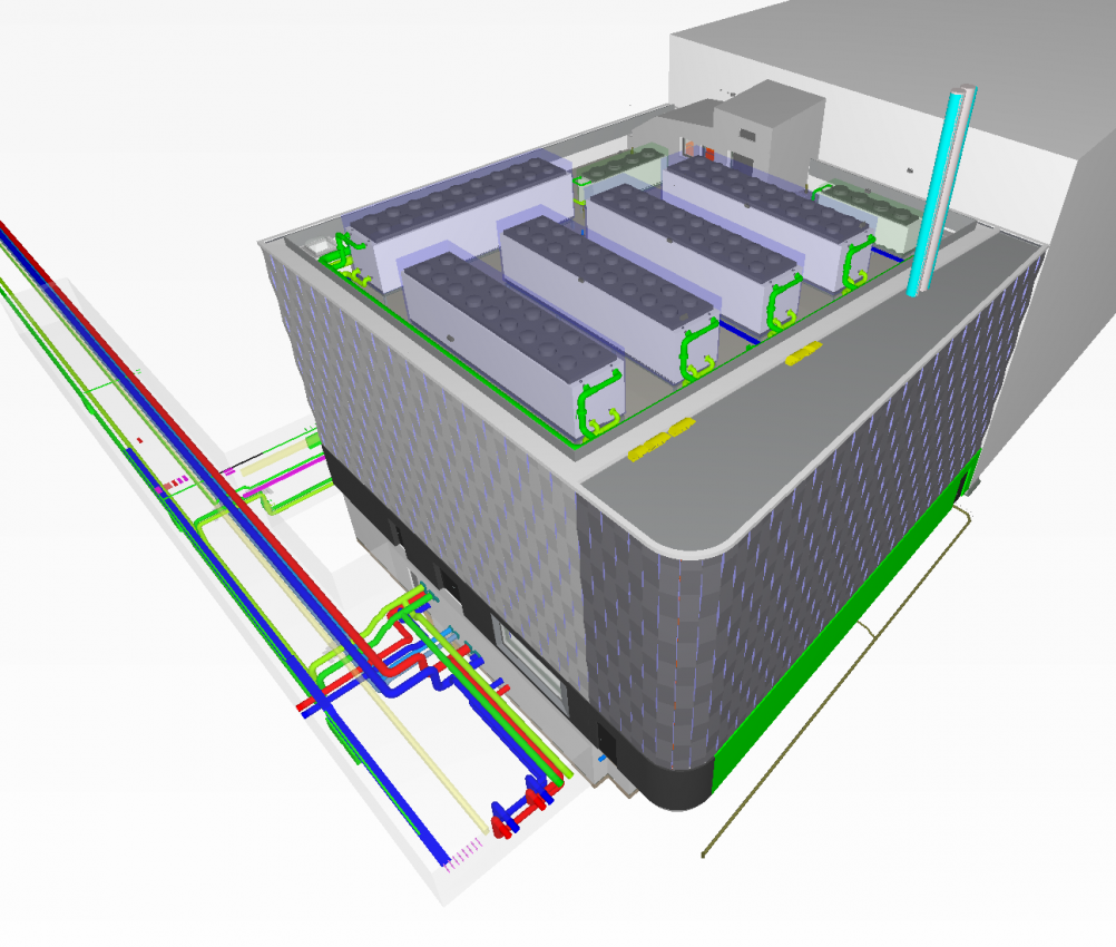 Von diesem zentralen Punkt aus werden die Gebäude über ein Nahwärme- und Kältenetz versorgt. Zusätzlich erfolgt die Bereitstellung von Netzersatzstrom.