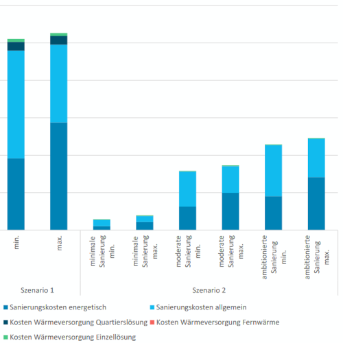 Der wirtschaftliche Vergleich der beiden Szenarien zeigt die Investitionskosten für die unterschiedlichen Sanierungs- und Versorgungskonzepte (die konkreten Investitionssummen sind im ausführlichen Bericht einsehbar). Diese Analyse bildet die wichtige Entscheidungsgrundlage für die zukünftige Sanierungsplanung und die Ausgestaltung der Wärmeversorgung.