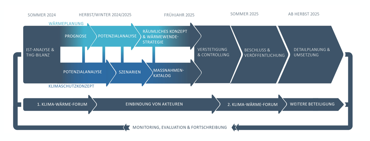 Sowohl das Integrierte Klimaschutzkonzept (IKK Heiligenhafen) als auch die kommunale Wärmeplanung (KWP Heiligenhafen) folgen einer klar vorgegebenen Struktur. Im Zuge des Projektverlaufs wurden beide Prozesse parallel umgesetzt und an entscheidenden Stellen miteinander verknüpft: